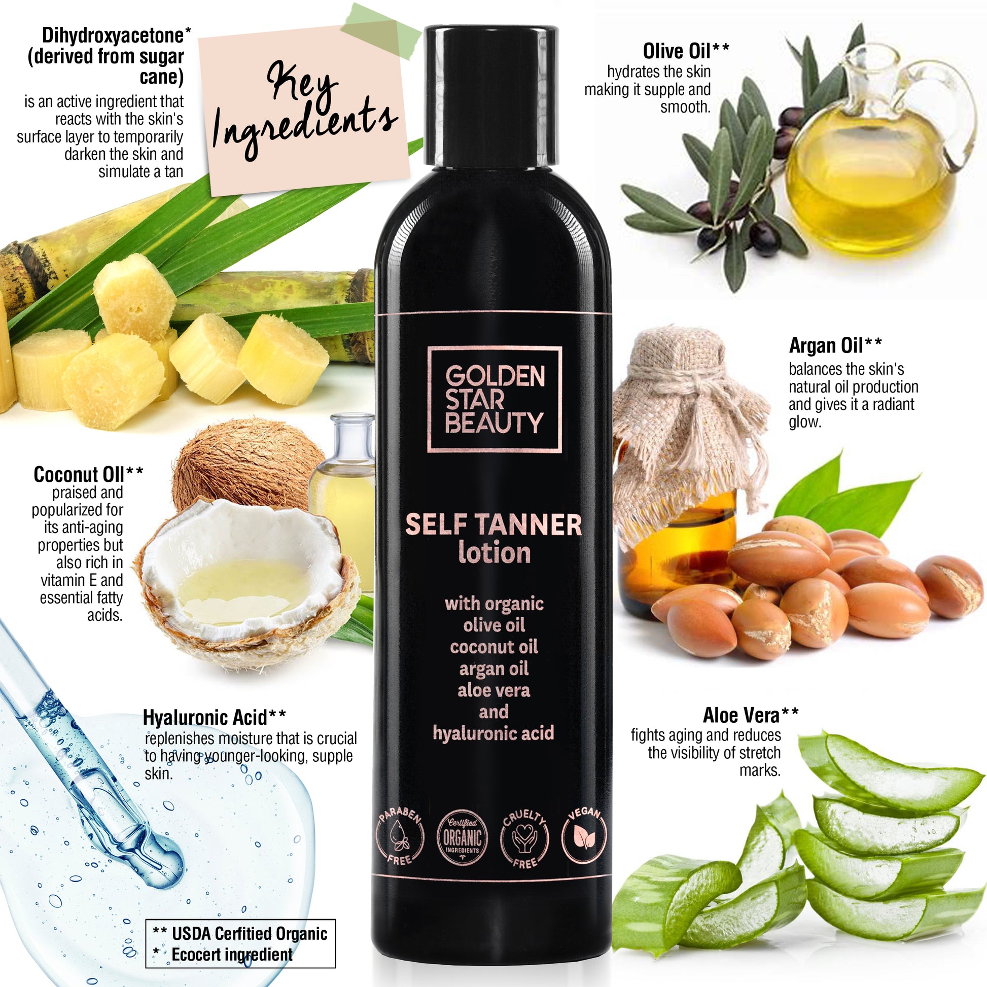 š“COMPROMISE FOR NOTHING LESS THAN THE BEST: Made in the USA under strick quality controls and featuring CERTIFIED ORGANIC OILS (olive oil, argan oil, jojoba oil, coconut oil, avocado oil), ORGANIC ALOE VERA, HYALURONIC ACID and INTENSE MOISTURIZERS. Our self tanning lotion is also PARABEN FREE, DYES FREE, GLUTEN FREE, VEGAN and CRUELTY FREE. Fight sunburn, early aging and skin cancer and reward your skin instead with our premium self tanner!
